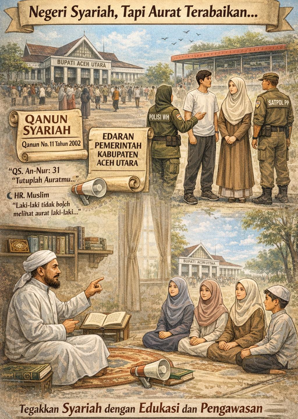 Namun, realitas di lapangan seringkali menunjukkan ironi. Fenomena yang terlihat setiap pagi dan sore di lapangan upacara didepan kantor Bupati landeng pusat pemerintahan kabupaten Aceh Utara yang dijadikan tempat olahraga bersama, memperlihatkan sebagian masyarakat—baik remaja maupun orang dewasa—masih beraktivitas dengan pakaian yang tidak menutup aurat.