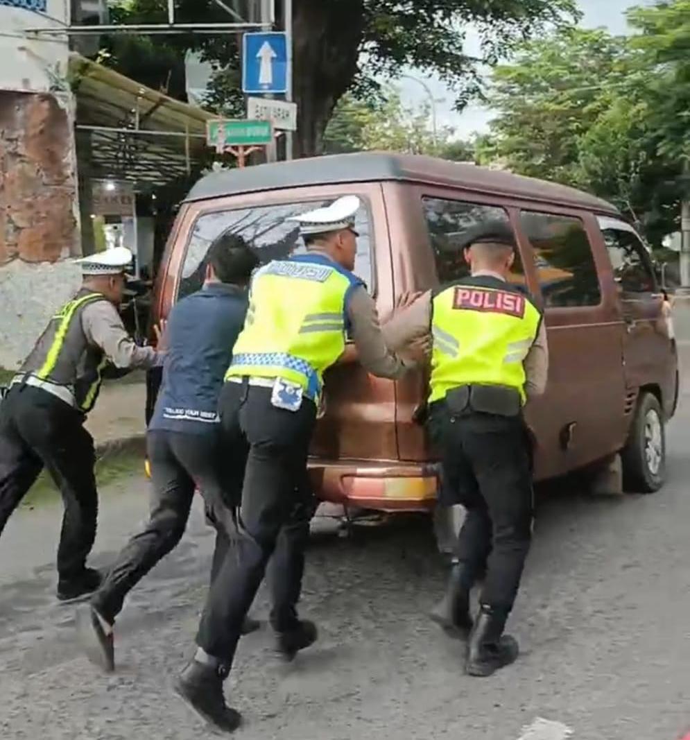 Melihat kondisi tersebut, petugas yang sedang melaksanakan pemantauan arus lalu lintas langsung turun tangan memberikan bantuan. Kendaraan didorong ke lokasi yang lebih aman guna menghindari kemacetan, sekaligus dilakukan pengecekan awal terhadap kondisi mobil.