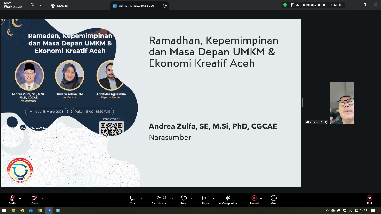 Webinar puncak ini menghadirkan akademisi sekaligus praktisi ekonomi syariah, Andrea Zulfa, SE., M.Si., Ph.D., CGCAE, yang membahas berbagai perspektif strategis terkait masa depan ekonomi daerah serta peran kepemimpinan dalam mendorong kemajuan UMKM dan ekonomi kreatif di Aceh.