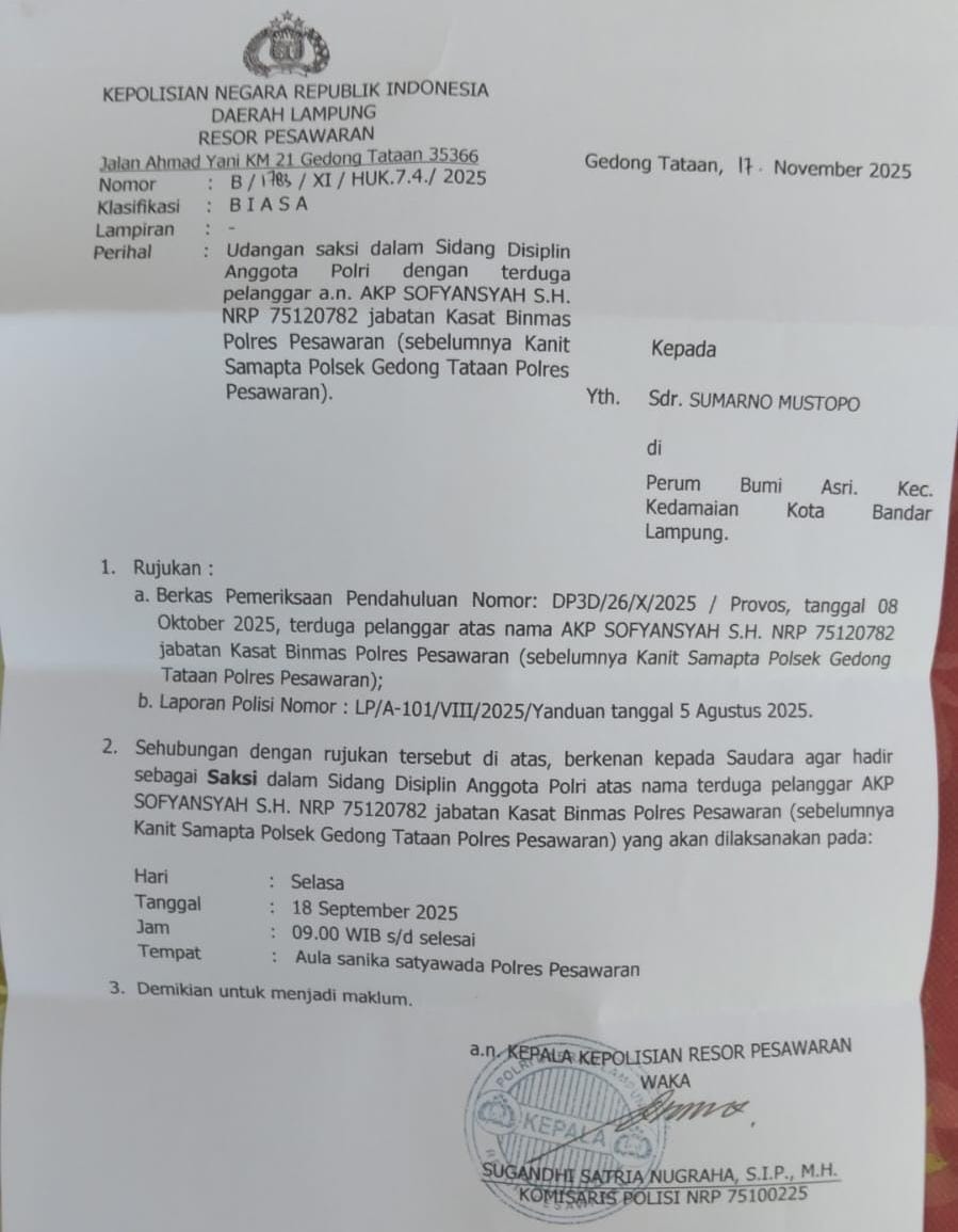 Hal itu sesuai dengan undangan yang diterima oleh Sumarno Mustopo pengusaha di Lampung yang menjadi korban arogansi seorang oknum Polri.