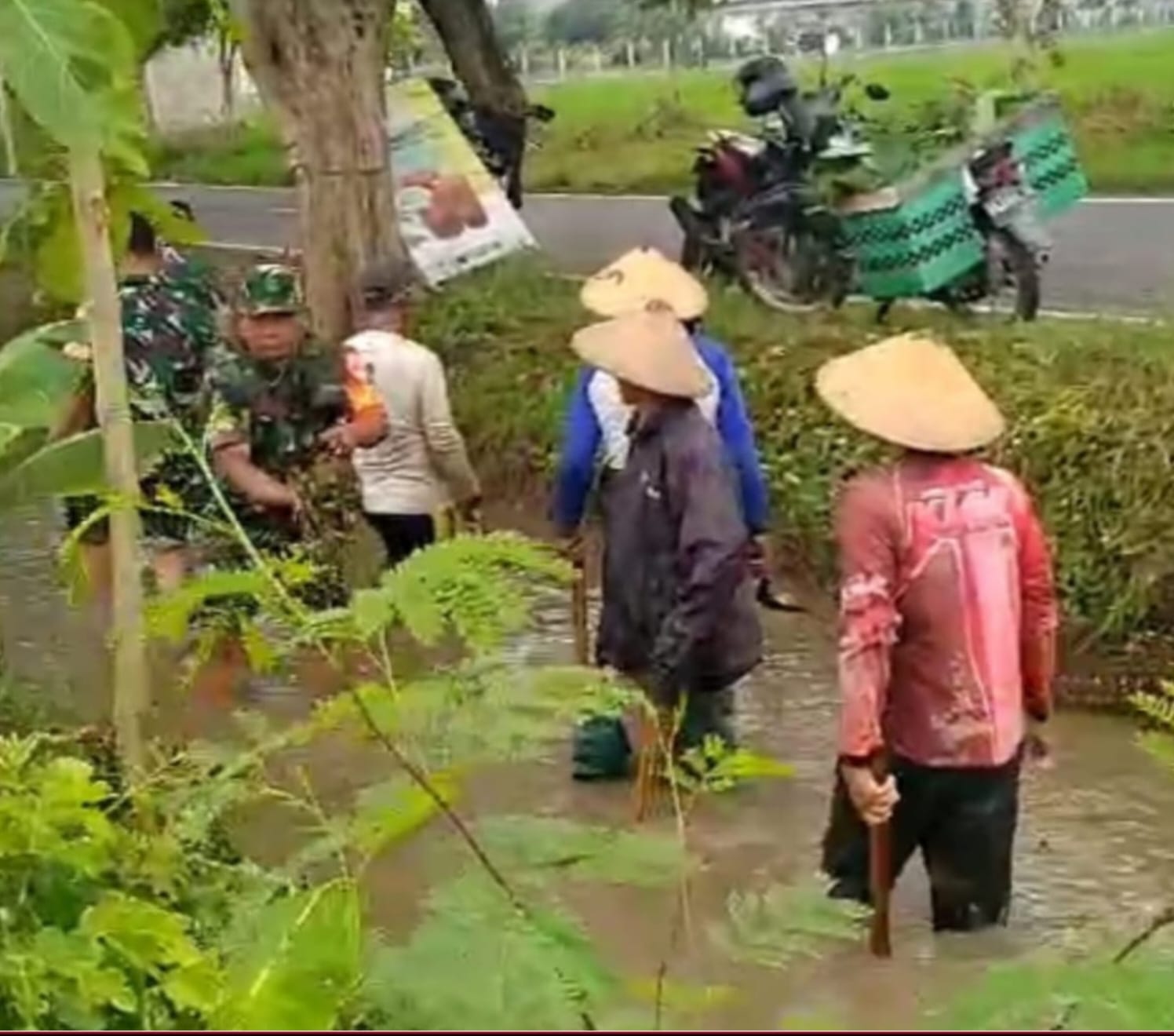 SRAGEN, JATENG –– Serka Purwanto Babinsa Koramil 07/Ngrampal Kodim 0725/Sragen bersama warga masyarakat melaksanakan kerja bakti pembersihan aliran sungai irigasi di Dk. Plosokerep, Desa Bandung Kec. Ngrampal, Selasa ( 07/01/2025 ).