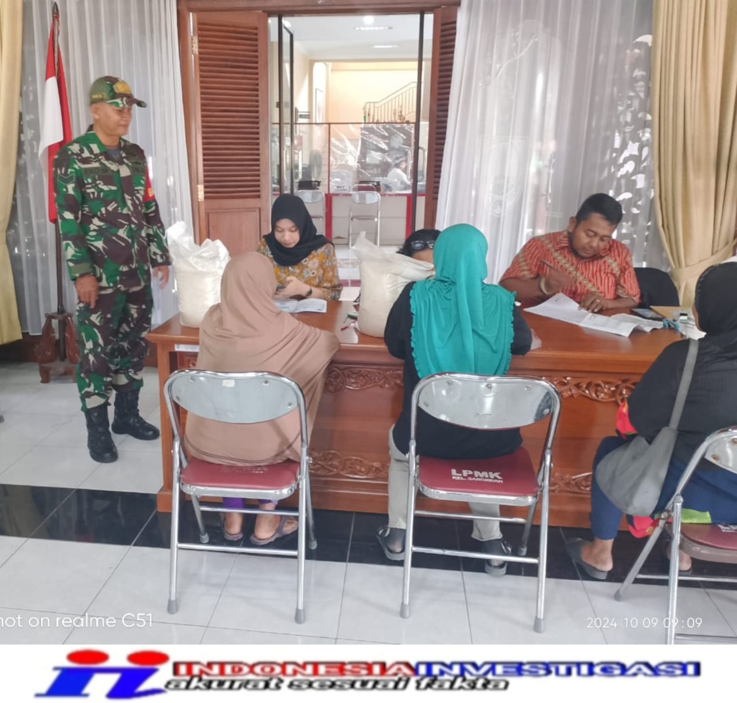 Surakarta – Babinsa Kelurahan Sangkrah Koramil 05/Pasarkliwon Kodim 0735/Surakarta, Sertu Eko ikut serta melaksanakan pendampingan dan pengamanan penyaluran bantuan pangan tahun 2024 berupa Beras 10 kg dari Bulog kepada warga masyarakat kurang mampu di wilayah Kelurahan Sangkrah, bertempat di pendopo Kelurahan Sangkrah Jln, indra Giri no 79, RT 01/ RW 01 kecamatan Pasarkliwon, Rabu (09/10/2024).