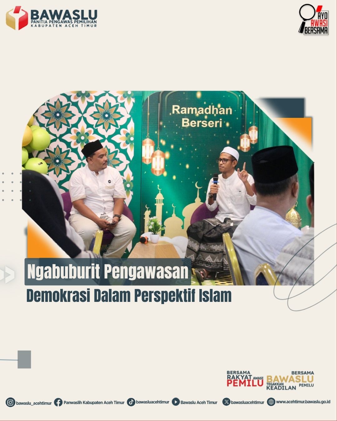 IDI RAYEUK, ACEH TIMUR – 4 Maret 2026 — Dalam momentum suci Ramadhan 1447 Hijriah, Badan Pengawas Pemilihan Umum Kabupaten Aceh Timur menggelar kegiatan edukatif bertajuk Ngabuburit Penguatan Spirit Kelembagaan Bawaslu dengan tema “Demokrasi dalam Perspektif Islam.” Kegiatan berlangsung khidmat dan penuh makna pada Rabu (4/3/2026) di The Royal Hotel Idi Rayeuk, Kabupaten Aceh Timur.