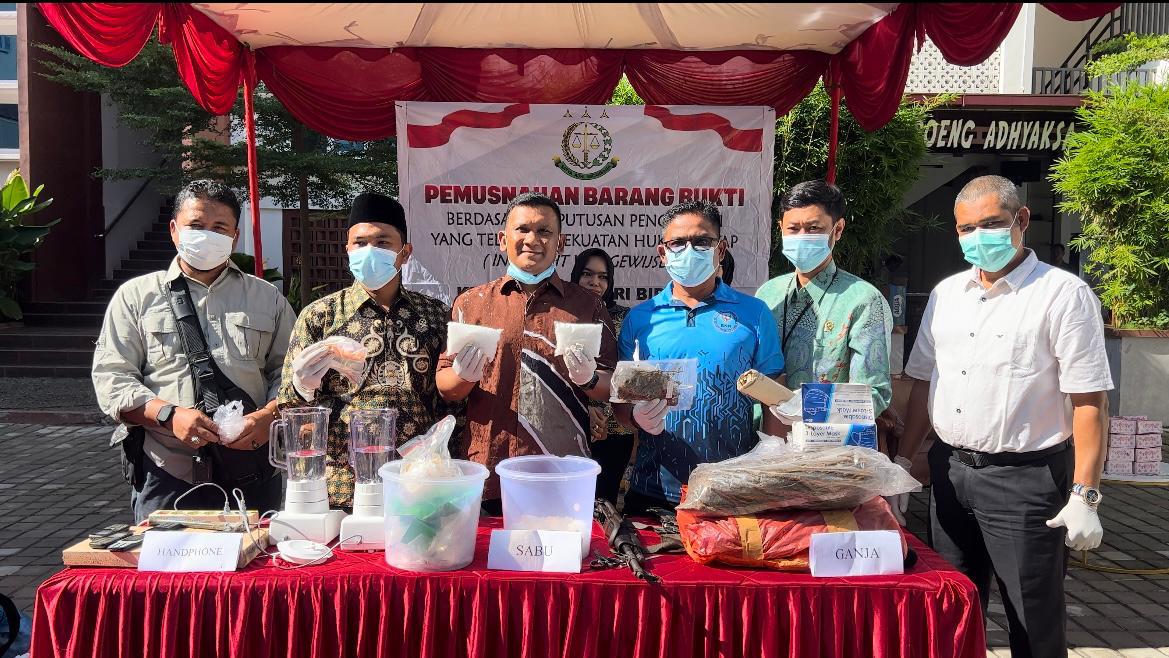 Barang bukti narkotika jenis sabu dilarutkan dengan air hingga tidak dapat digunakan lagi. Ganja dibakar sampai habis, sedangkan senjata api jenis AK-56 dan magazennya dipotong menjadi beberapa bagian. Barang bukti lain seperti senjata tajam, bong, dan perlengkapan kejahatan dihancurkan atau dibakar.