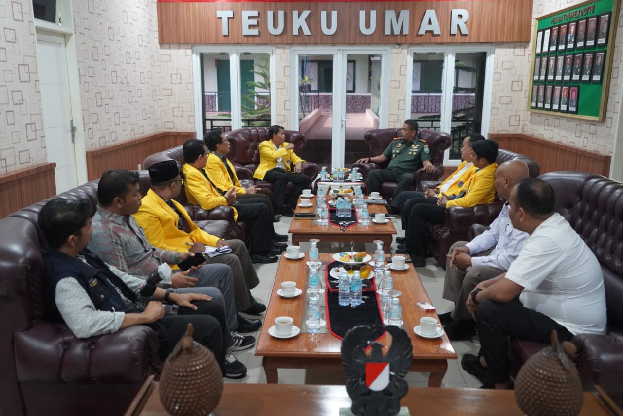 Meulaboh – Danrem 012/Teuku Umar, Kolonel Inf Benny Rahadian, S.E., M.Han., menerima kunjungan silaturahmi Rektor Universitas Teuku Umar (UTU), Prof. Dr. Drs. Ishak Hasan, M.Si., beserta rombongan di ruang lobi Makorem 012/TU, Desa Ujung Tanoh Darat, Kecamatan Meureubo, Selasa (18/2).