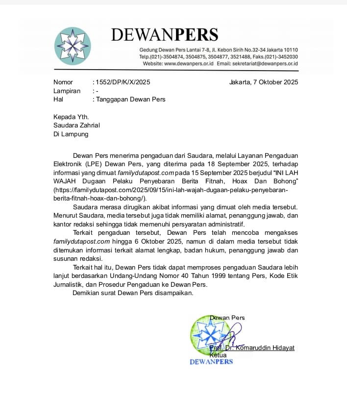 Dalam surat yang ditandatangani Prof. Dr. Komaruddin Hidayat, Dewan Pers menyatakan hasil penelusuran hingga 6 Oktober 2025 tidak menemukan alamat kantor, badan hukum, penanggung jawab, maupun susunan redaksi pada situs tersebut. Karena itu, pengaduan tidak dapat diproses melalui mekanisme hukum pers.