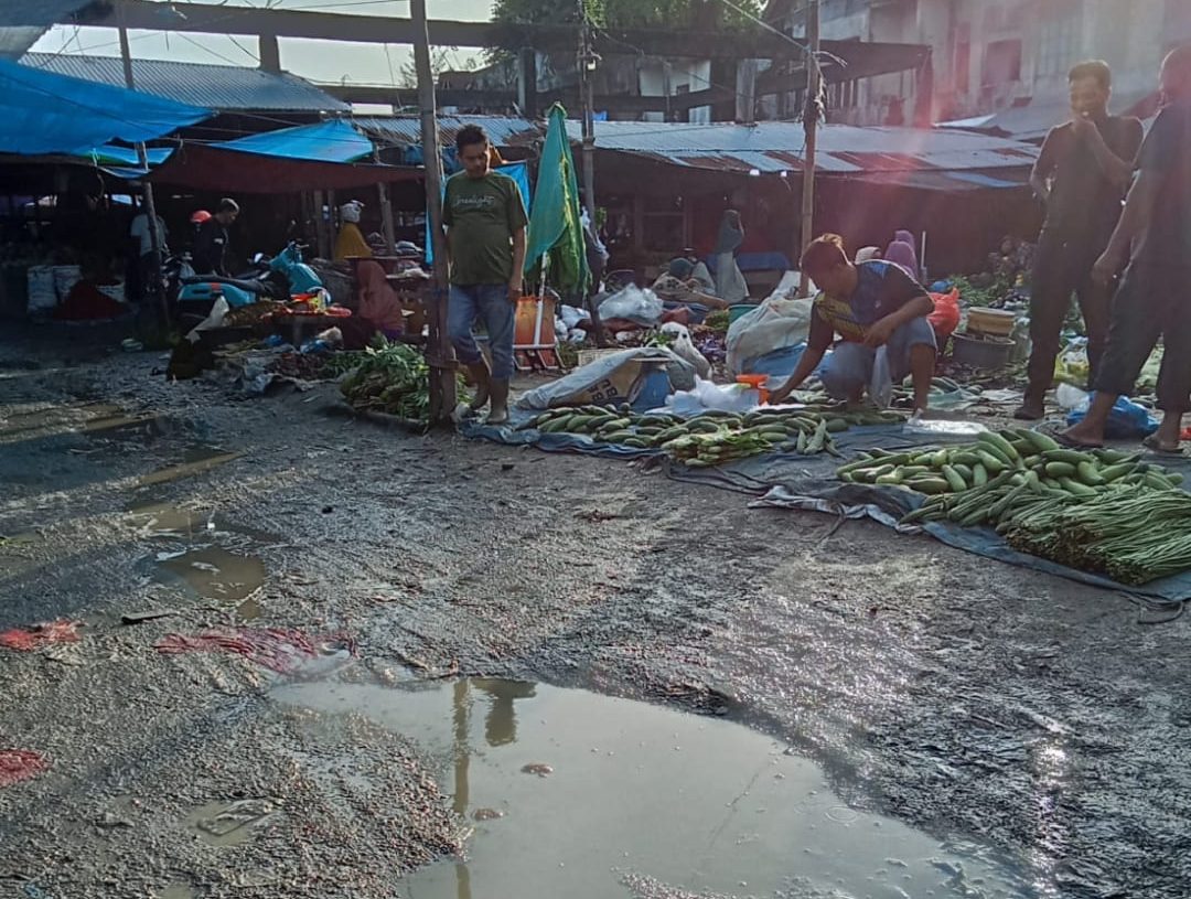 Pantauan media ini dilokasi, kondisi jalan pasar pagi tampak becek, jika terjadi curah hujan tinggi genangan air akan mengendap.