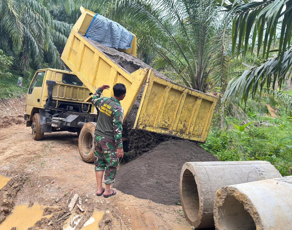 Dengan penuh semangat gotong royong, personel Satgas TMMD bersama masyarakat bahu-membahu menurunkan pasir dari kendaraan pengangkut ke titik penumpukan yang telah disiapkan. Kebersamaan antara TNI dan warga terlihat begitu harmonis, mencerminkan kemanunggalan TNI dengan rakyat yang menjadi roh utama program TMMD.