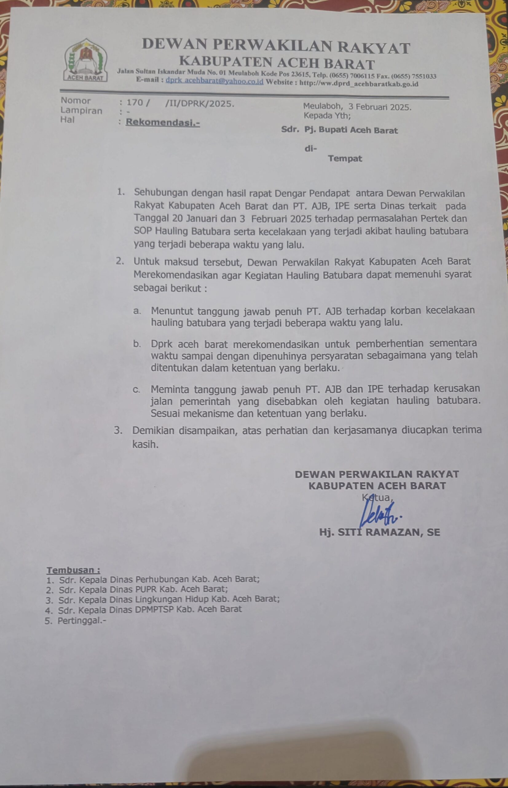 Dalam hasil RDP, ketua DPRK Hj. Siti Ramazan, SE, mengeluarkan surat rekomendasi nomor 137/II/DPRK/2025 kepada PJ Bupati Aceh Barat terhadap permasalahan Pertek dan SOP Hauling Batubara serta kecelakaan yang terjadi akibat hauling batubara yang terjadi beberapa waktu yang lalu.