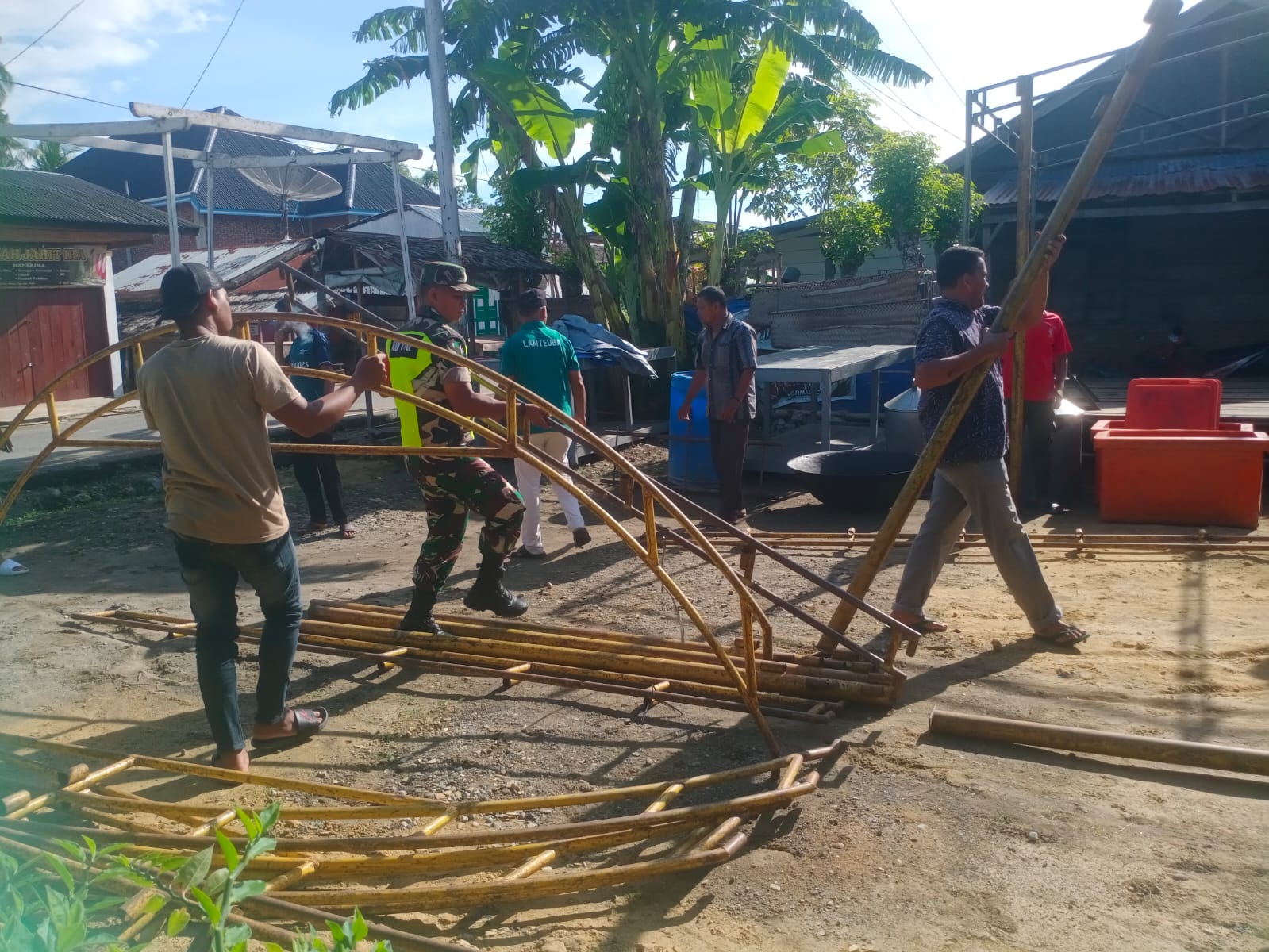 Indonesiainvestigasi, Sigli-Babinsa Koramil 01/Muara Tiga Kodim 0102/Pidie membantu pemasangan tenda dalam rangka acara hajatan atau pesta bertempat di Gampong Mesjid Kecamatan Muara Tiga Kabupaten Pidie, Kamis (14/11/2024)