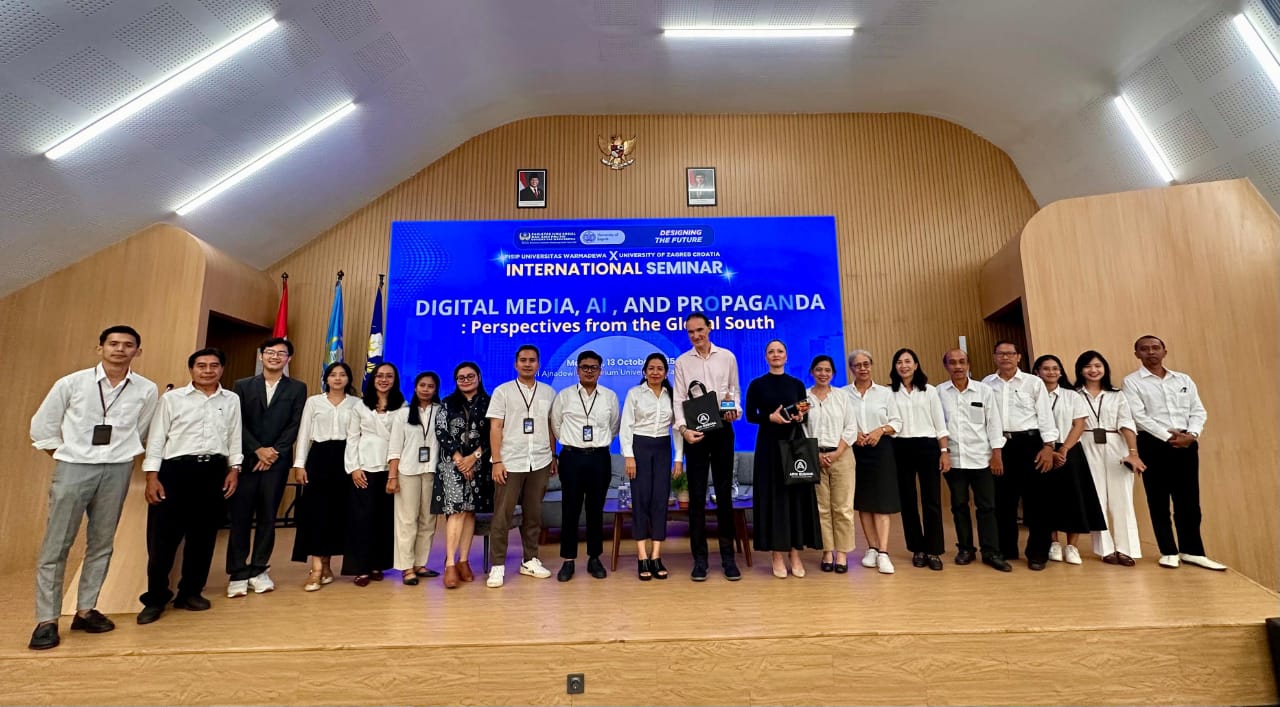 Fakultas Ilmu Sosial dan Ilmu Politik (FISIP) Universitas Warmadewa bekerja sama dengan University of Zagreb, Kroasia, menyelenggarakan Seminar Internasional bertajuk “Digital Media, AI, and Propaganda: Perspectives from the Global South.” Kegiatan ini berlangsung pada Senin, 13 Oktober 2025, di Auditorium Sri Ajnadewi, Fakultas Teknik dan Perencanaan Universitas Warmadewa.(Dok/istimewa).