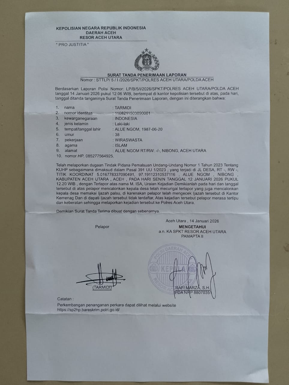Berdasarkan Surat Tanda Penerimaan Laporan (STTLP) yang dikeluarkan Polres Aceh Utara tertanggal 14 Januari 2026, seorang warga bernama Tarmidi (38), warga Alue Ngom, melaporkan dugaan Tindak Pidana Pemalsuan sebagaimana diatur dalam Pasal 391 UU Nomor 1 Tahun 2023 tentang KUHP.