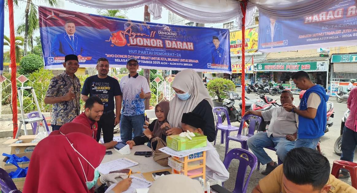 BIREUEN – Memperingati Hari Ulang Tahun (HUT) Partai Demokrat ke-24, Dewan Pimpinan Cabang (DPC) Partai Demokrat Kabupaten Bireuen menggelar aksi donor darah di Alun-Alun Kota Bireuen, Selasa (9/9/2024). Kegiatan ini bekerja sama dengan Palang Merah Indonesia (PMI) serta Unit Transfusi Darah (UTD) RS Fauziah Bireuen.