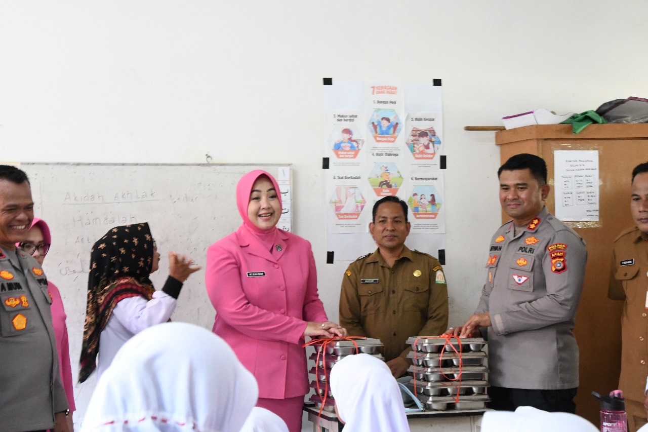 Usai melakukan pemotongan pita sebagai pertanda diresmikannya dapur sehat makan bergizi gratis (MBG), Kapolres melepas operasional SPPG Kemala Bhayangkari Polres Aceh Timur dan menyerahkan secara simbolis MBG di MIN 2 Aceh Timur, Desa Blang Uyok, Kecamatan Julok.