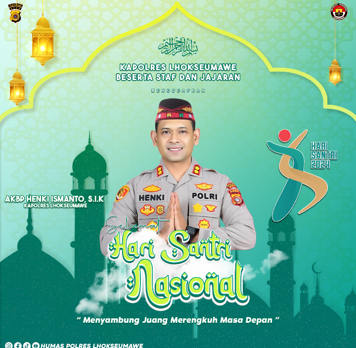 Lhokseumawe – Dalam momentum peringatan Hari Santri Nasional yang jatuh pada 22 Oktober, Kapolres Lhokseumawe, AKBP Henki Ismanto, S.I.K., menyampaikan ucapan selamat kepada seluruh santri di wilayah Lhokseumawe dan sekitarnya. Kapolres berharap agar para santri dapat terus menjadi contoh teladan dalam kehidupan berbangsa dan bernegara.