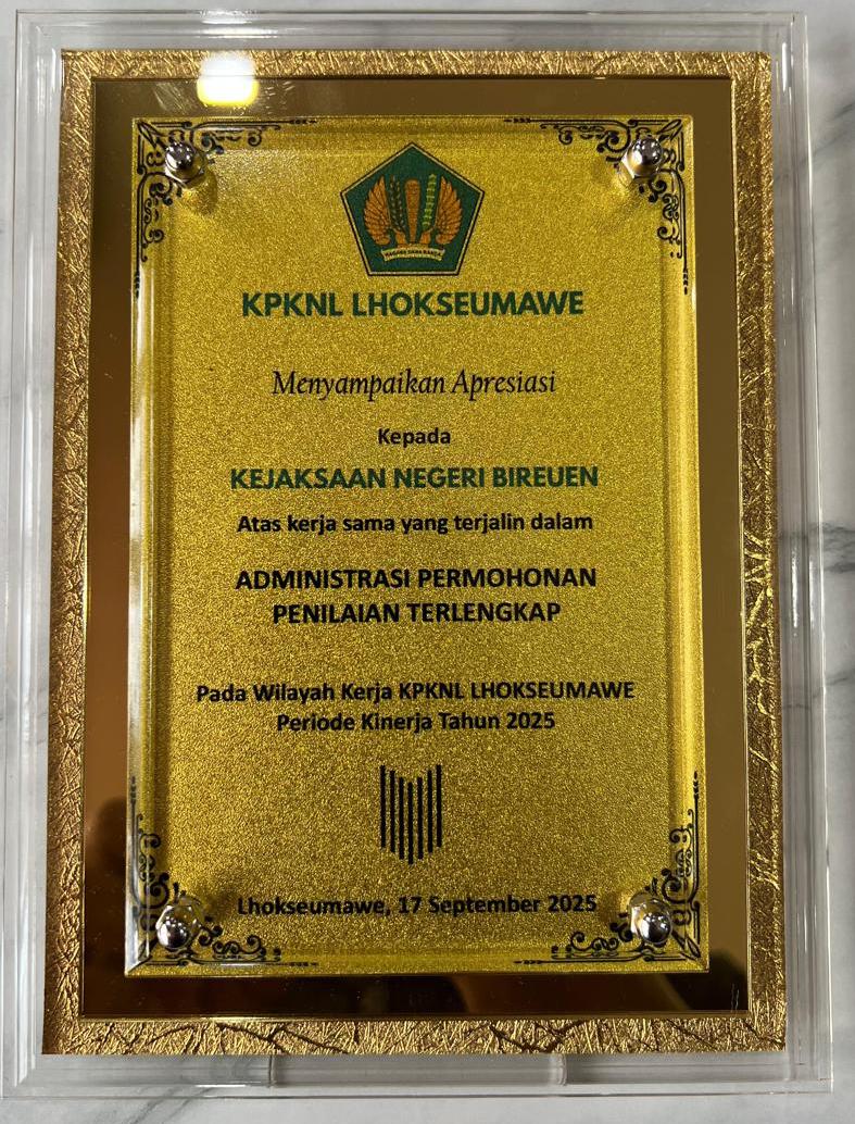 BIREUEN – Kejaksaan Negeri (Kejari) Bireuen menerima penghargaan Apresiasi Pengelolaan Kekayaan Negara Tahun 2025 dari Kantor Pelayanan Kekayaan Negara dan Lelang (KPKNL) Lhokseumawe.