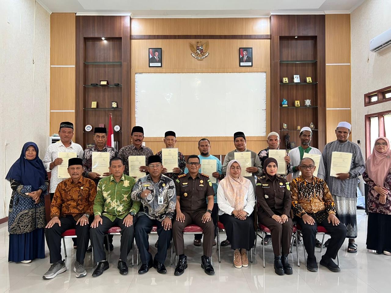 BIREUEN — Kepala Kejaksaan Negeri Bireuen, Munawal Hadi, S.H., M.H., didampingi oleh Kepala Seksi Perdata dan Tata Usaha Negara Hanita Azrica, S.H., M.H., bersama Tim Jaksa Pengacara Negara, menyerahkan sebanyak 50 (lima puluh) sertifikat tanah wakaf kepada para nazhir (pengelola wakaf). Penyerahan ini turut dihadiri oleh Kepala Kantor Kementerian Agama Kabupaten Bireuen, Dr. H. Zulkifli, M.Pd., dan Kepala Badan Pertanahan Nasional (BPN) Kabupaten Bireuen, Anny Setiawati, A.P., TnH., M.M., bertempat di Aula Kejaksaan Negeri Bireuen, rabu 7 mei 2025.