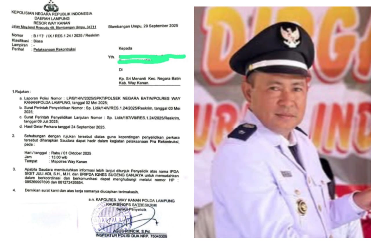 WAYKANAN – Empat orang terlapor tidak hadir hanya Kepala Kampung Sri Menanti Abdul Roni hadiri Rekonstruksi di Mapolres Way Kanan, Rabu 1 September 2025.