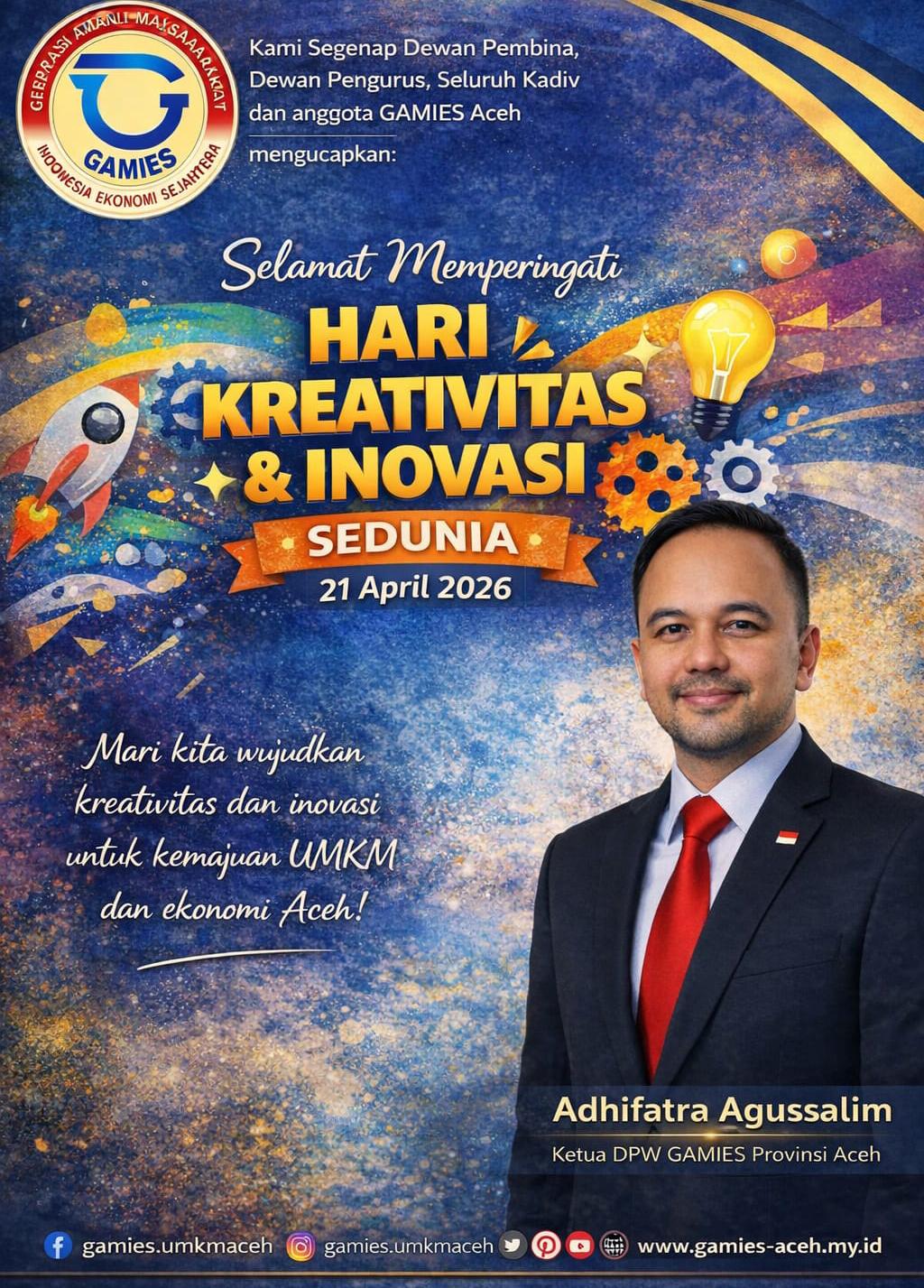 BANDA ACEH – Dalam rangka memperingati Hari Kreativitas dan Inovasi Sedunia yang jatuh setiap tanggal 21 April, Ketua Dewan Pimpinan Wilayah (DPW) GAMIES Provinsi Aceh, Adhifatra Agussalim, mengajak seluruh elemen masyarakat, khususnya generasi muda, pelaku UMKM, dan pegiat ekonomi kreatif di Aceh untuk terus menumbuhkan semangat berkarya serta menghadirkan inovasi di berbagai sektor kehidupan.