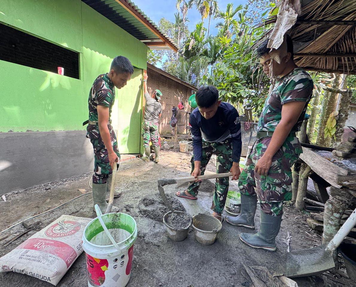 Terlihat personel Satgas TMMD bersama warga setempat bahu-membahu mengaduk serta menuangkan campuran semen untuk memperkuat dinding bagian bawah rumah. Tahap pengerasan ini menjadi bagian penting dalam proses rehabilitasi, guna memastikan bangunan lebih kokoh, tahan lama, dan nyaman dihuni.