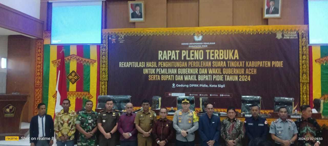 Pembukaan Rapat Pleno Terbuka Tingkat Kabupaten tersebut, dihadiri oleh Perwakilan Forkopimda Kabupaten Pidie, Ketua Bawaslu Kabupaten Pidie, Ketua Panwaslih Kabupaten Pidie, Perwakilan PPK se-Kabupaten Pidie serta saksi paslon pada Pilkada Serentak di Kabupaten Pidie tahun 2024.