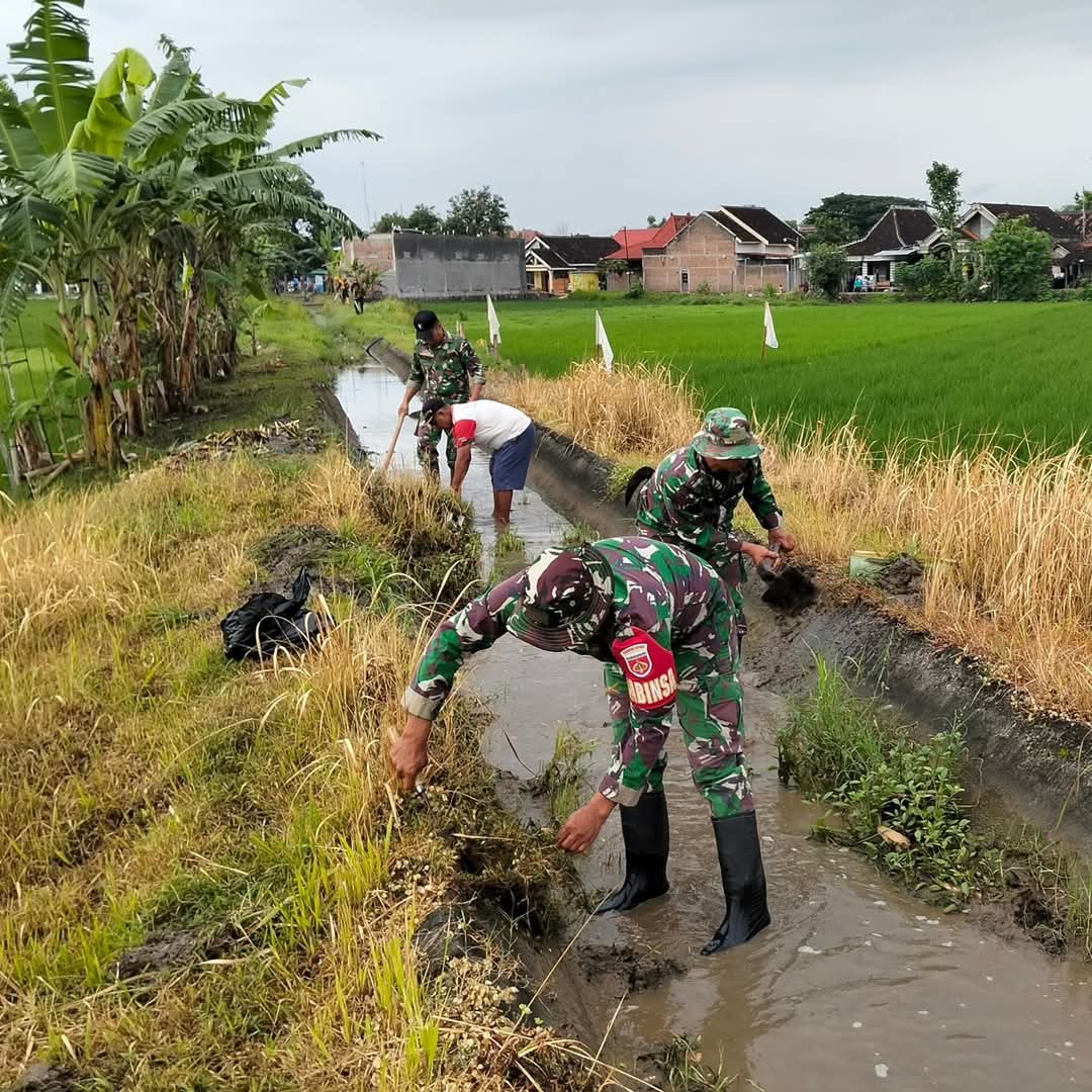 Bersama warga, Anggota Koramil 13/Nogosari bekerja bakti membersihkan irigasi yang tersumbat tanah dan banyaknya rumput yang menyebabkan tersumbatnya aliran air pada areal persawahan milik warga