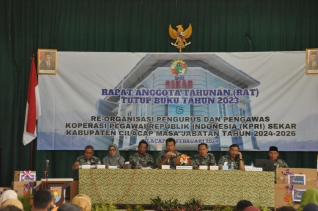 Cilacap, Jawa Tengah– Rapat Anggota Tahunan (RAT) Tutup Buku Tahun 2023 dan Reorganisasi Pengurus serta Pengawas Koperasi Pegawai Republik Indonesia (KPRI) Sekar Kabupaten Cilacap Masa Jabatan Tahun 2024-2026 digelar di Gedung Graha Darussalam pada Rabu (28/02/2024).