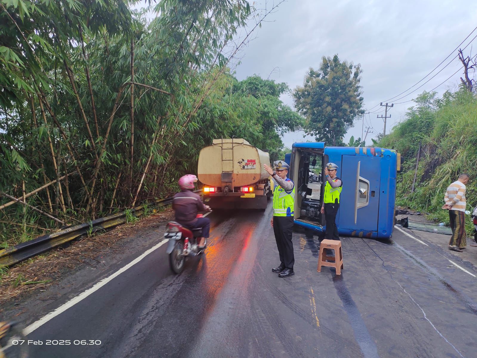Beberapa waktu kemudian petugas Kepolisian yang bertugas di Pos Lantas rest Area Kampung Gunung Labuhan bersama Polsek Baradatu datang dan membantu pengemudi dan penumpang.