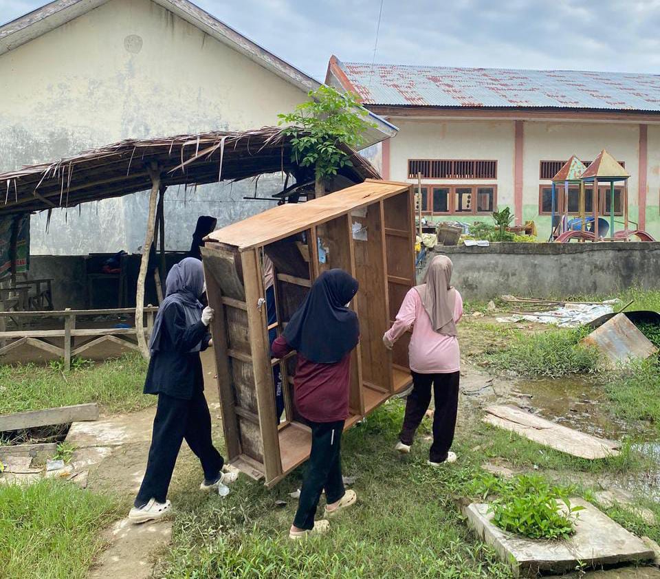 Menanggapi kondisi tersebut, enam mahasiswi KPM Tematik Kebencanaan UIN Ar-Raniry Banda Aceh yang berlatar belakang keilmuan Ilmu Perpustakaan turun langsung melakukan aksi penyelamatan terhadap ruang dan koleksi perpustakaan. Kegiatan yang dilakukan meliputi pembersihan lumpur dan pengeringan koleksi sebagai langkah awal pemulihan fungsi literasi sekolah.