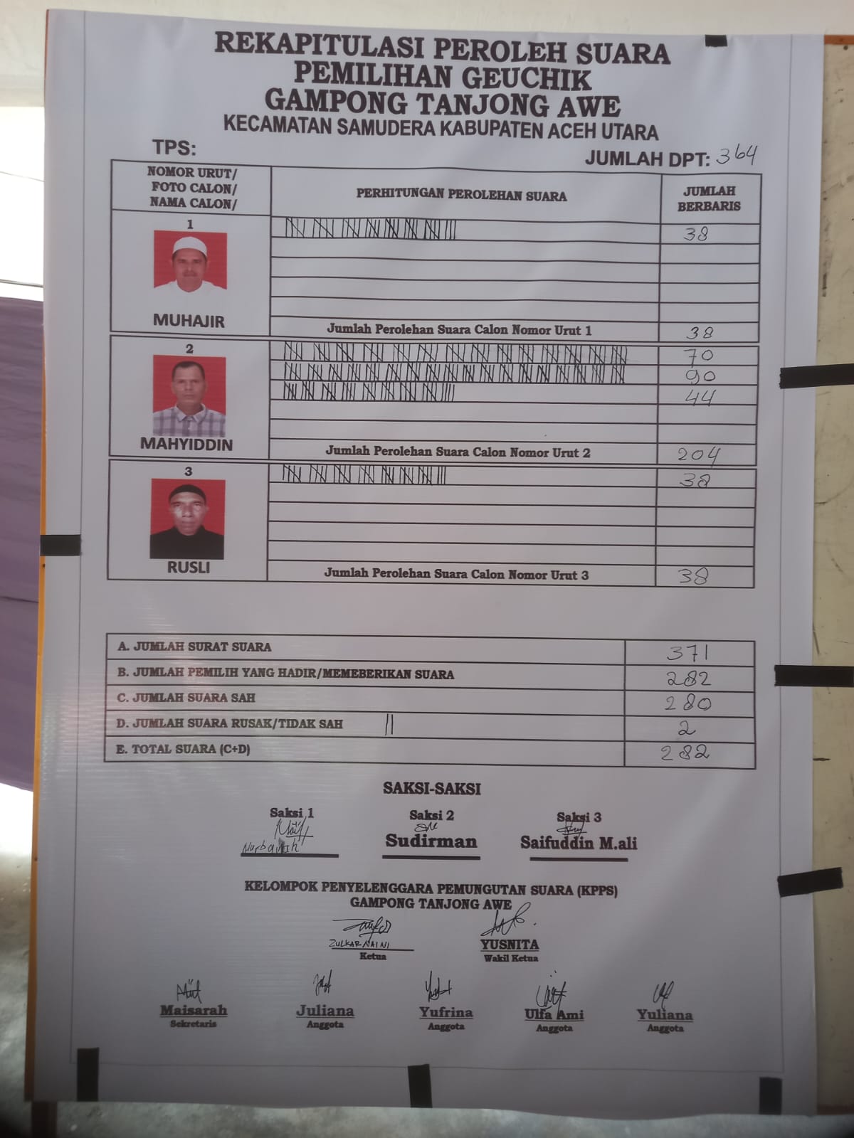 Dari total 364 Daftar Pemilih Tetap (DPT), tercatat 282 pemilih hadir memberikan hak suaranya. Jumlah suara sah sebanyak 280 sementara 2 suara dinyatakan tidak sah.