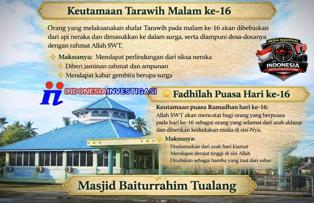 Malam ke-16 Ramadhan menjadi momentum penting untuk memperkuat qiyamullail, termasuk shalat Tarawih. Dalam berbagai riwayat fadhail Ramadhan disebutkan bahwa orang yang menghidupkan malam ke-16 dengan ibadah akan mendapatkan pembebasan dari siksa dan limpahan rahmat Allah SWT. Terlepas dari perbedaan kualitas riwayat yang ada, semangat yang ingin ditanamkan sangat jelas: Allah membuka pintu ampunan selebar-lebarnya bagi hamba yang bersungguh-sungguh.