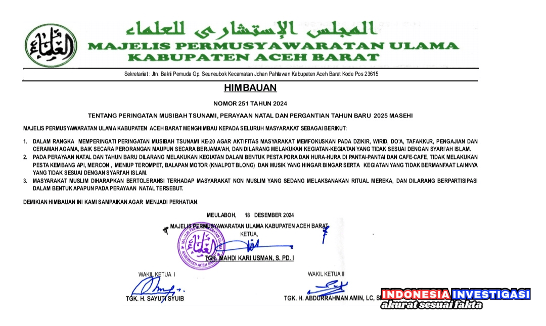 Meulaboh – Majelis Permusyarawatan Ulama (MPU) Kabupaten Aceh Barat mengeluarkan Surat Himbauan untuk seluruh masyarakat agar tidak melakukan hal yang berlebihan di dalam menyambut tahun baru 2025, Jum’at (20/12/2024).