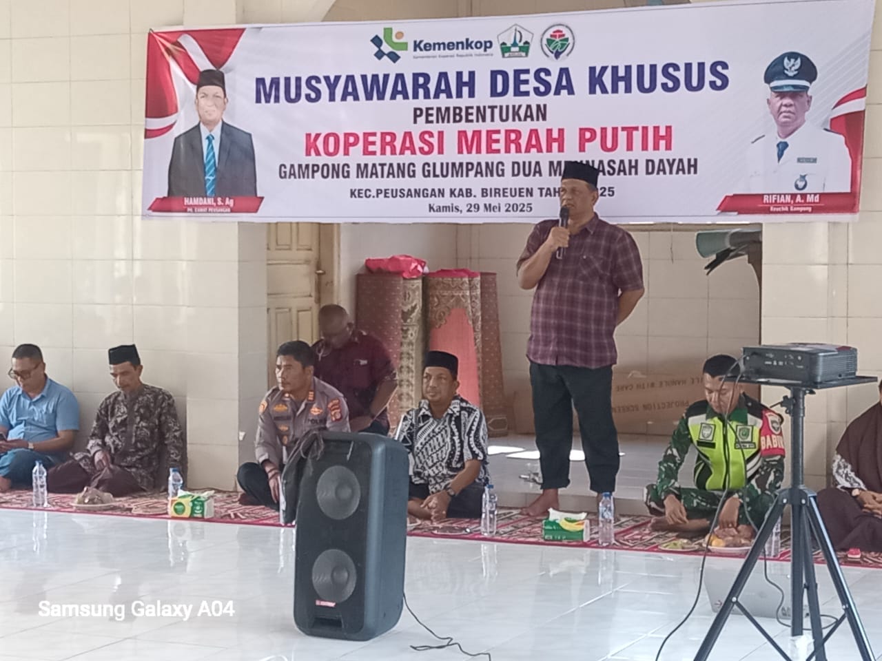 BIREUEN – Pemerintah Gampong Matang Geulumpang Dua Meunasah Dayah, Kecamatan Peusangan, Kabupaten Bireuen, menggelar Musyawarah Desa Khusus (Musdesus) pada Kamis, 29 Mei 2025. Agenda utama dalam kegiatan tersebut adalah pembentukan Koperasi Desa Merah Putih (KopdesMP) Syariah.