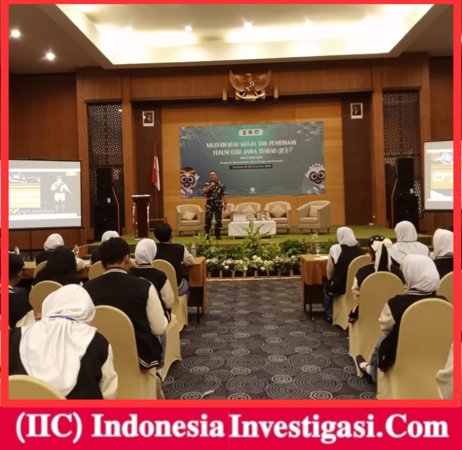 Kasdim 0735/Surakarta Mayor Inf Suwarko, A. M.d. Pada kesempatan ini sebagai narasumber memberikan materi dengan tema “Kepemimpinan Masa Depan Menuju Indonesia Emas 2045” pada kegiatan “Musyawarah Kerja Dan Pembinaan Forum OSIS Jawa Tengah SMA/SMK/MA Tahun 2024.” Dengan peserta sebanyak 105 orang terdiri dari 38 Kota/Kab Jawa Tengah.