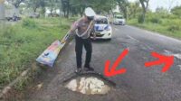 Anggota Satlantas Polres Bangkalan; Tambal Jalan Berlubang Di area Suramadu Sisi Madura