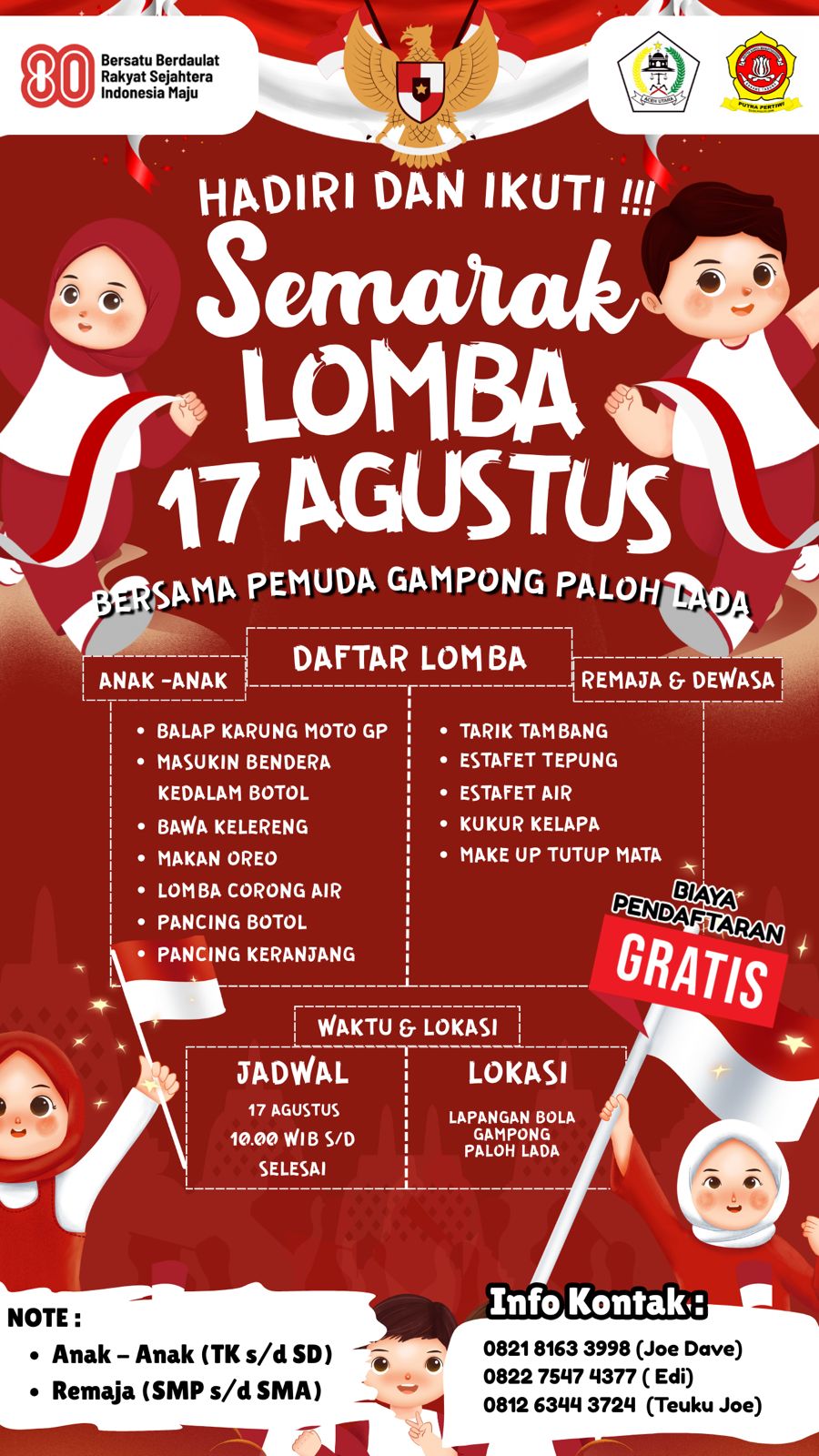 DEWANTARA, ACEH UTARA – Seusai peringatan Hari Ulang Tahun ke-80 Republik Indonesia, pemuda Gampong Paloh Lada menggelar berbagai perlombaan untuk memeriahkan suasana kemerdekaan, Minggu (17/8).