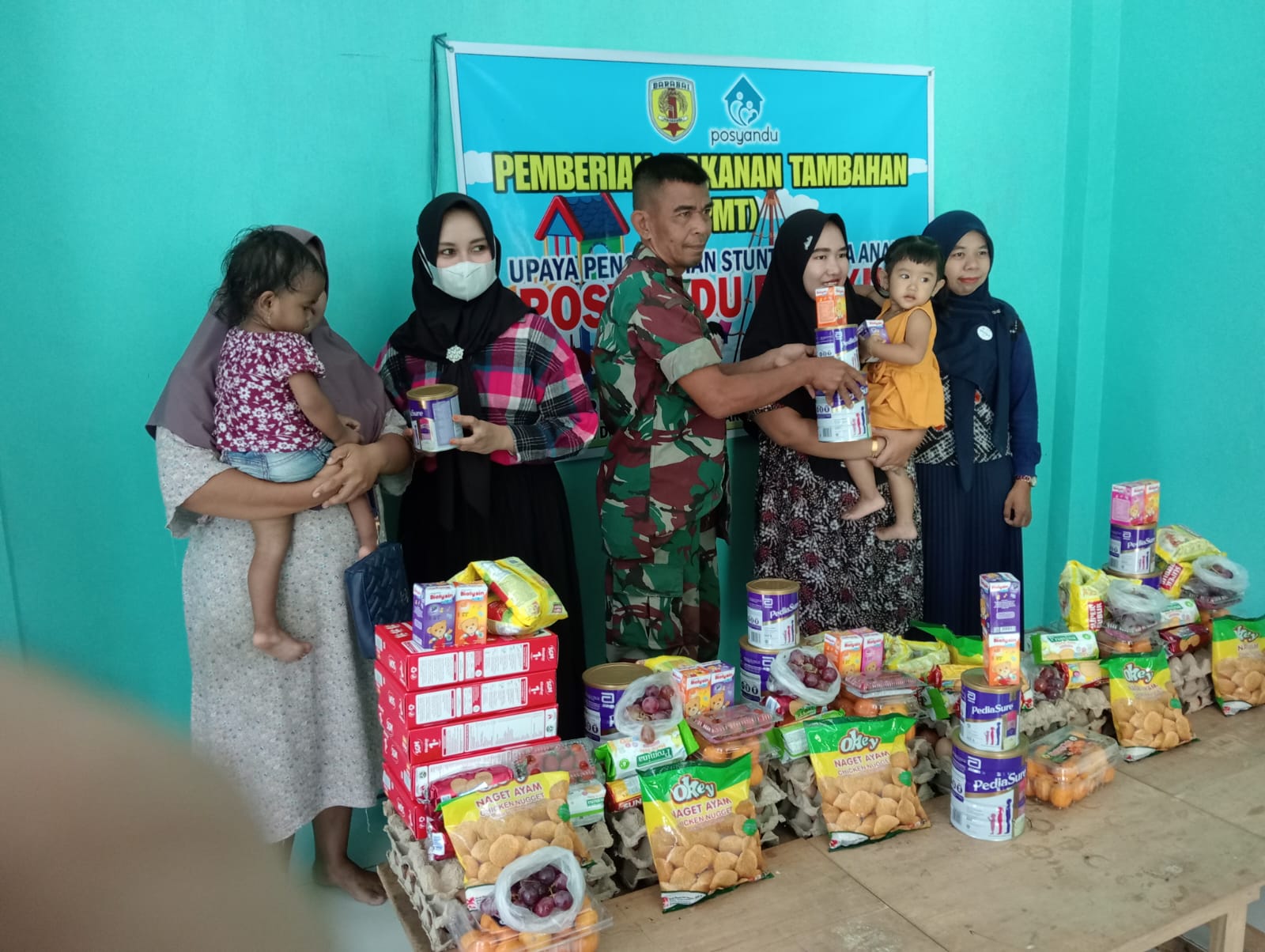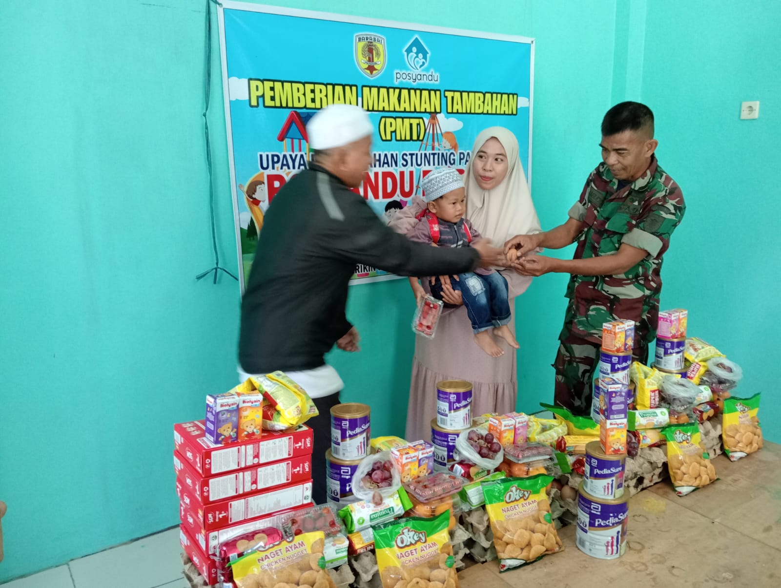 Dalam kegiatan ini, Babinsa bersama tenaga kesehatan dan Kepala Desa Barikin memberikan Makanan Tambahan kepada 7 balita yang masuk dalam kategori stunting.