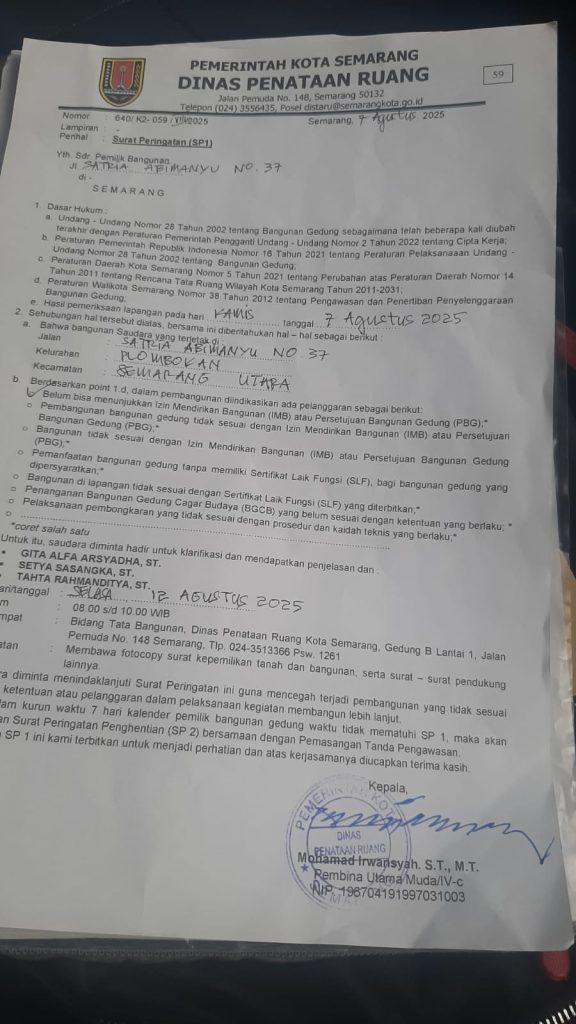 Berdasarkan informasi yang diperoleh wartawan di lapangan, Dinas Penataan Ruang Kota Semarang sebelumnya telah mengirimkan surat teguran pertama kepada pihak PT KAI dengan Nomor 640/K2-059/VIII/2025 tertanggal 12 Agustus 2025. Surat tersebut ditandatangani oleh almarhum Mohamad Irwansyah, S.T., M.T., selaku pejabat Dinas Penataan Ruang.