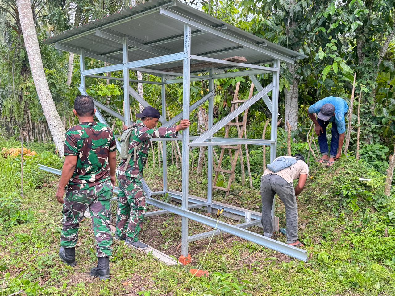 Pengerjaan MCK dilakukan secara bertahap, mulai dari pembuatan pondasi, pemasangan dinding, hingga penyelesaian atap dan instalasi saluran air. Satgas TMMD bersama warga setempat terlibat aktif dalam setiap proses pembangunan dengan semangat gotong royong.