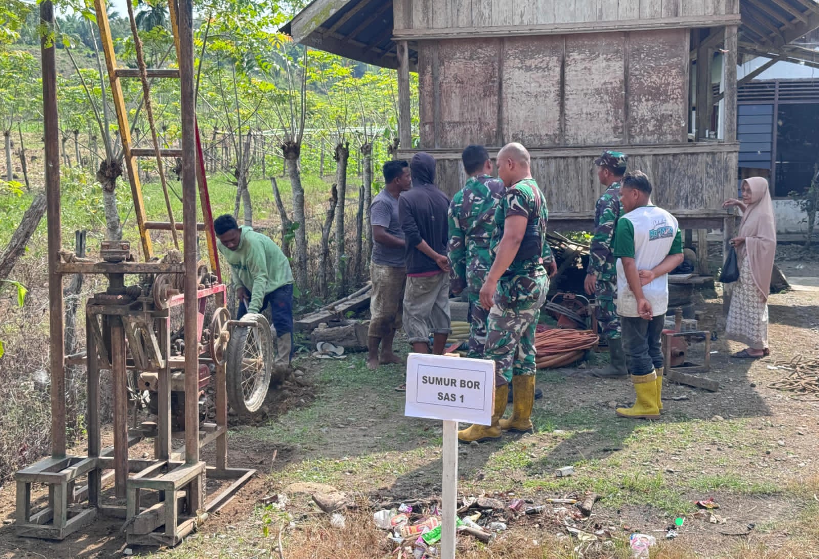 Dalam proses pengeboran, tampak personel TNI bersama warga setempat bekerja sama agar pengerjaan berjalan lancar. Dengan peralatan yang memadai, sumur bor ini diharapkan dapat menyediakan pasokan air bersih yang cukup untuk kebutuhan rumah tangga maupun pertanian masyarakat desa.
