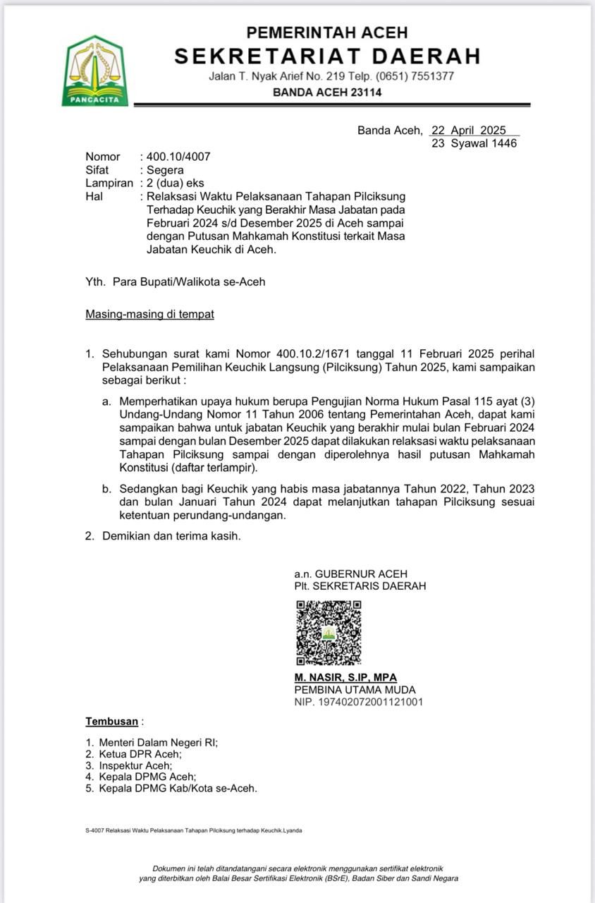 Dalam surat tersebut, pemerintah Aceh menegaskan bahwa pelaksanaan tahapan pilchiksung bagi geuchik yang masa jabatan berakhir mulai Februari 2024 hingga Desember 2025 dapat di tunda sementara,sambil menunggu hasil putusan mahkamah kontitusi(MK)terkait uji materi pasal 115 ayat( 3) Undang-Undang Pemerintah Aceh nomor 11 tahun 2006 tentang pemerintah Aceh.
