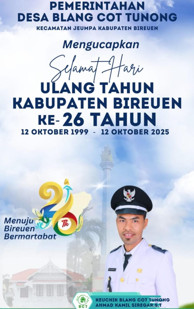 BIREUEN, 7 Oktober 2025 —Pemerintahan Desa Blang Cot Tunong, Kecamatan Jeumpa, Kabupaten Bireuen, dengan penuh semangat menyampaikan ucapan selamat Hari Ulang Tahun Kabupaten Bireuen yang ke-26, yang akan diperingati pada 12 Oktober 2025 mendatang.