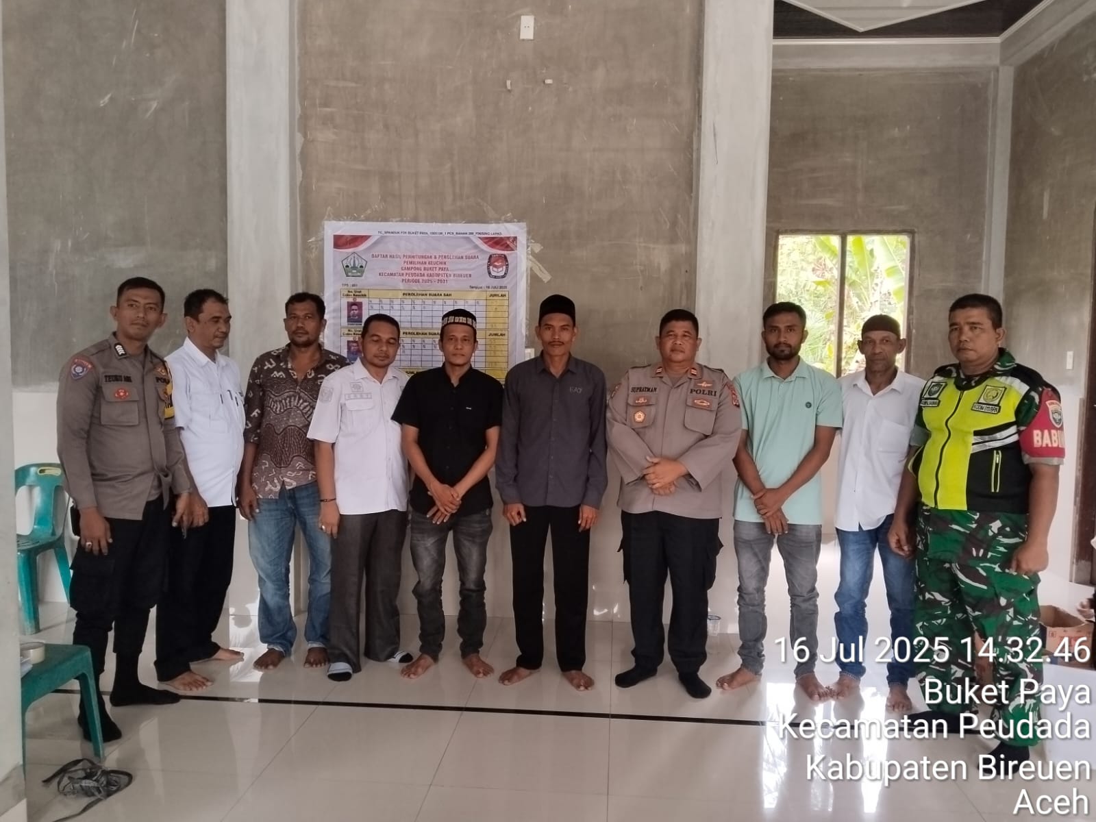 Turut hadir pula Kapolsek Peudada dan Babinsa mewakili Danramil Peudada, yang memastikan jalannya pemilihan berlangsung tertib dan aman. Kehadiran unsur TNI–Polri menjadi bentuk nyata dukungan terhadap stabilitas di tingkat desa.