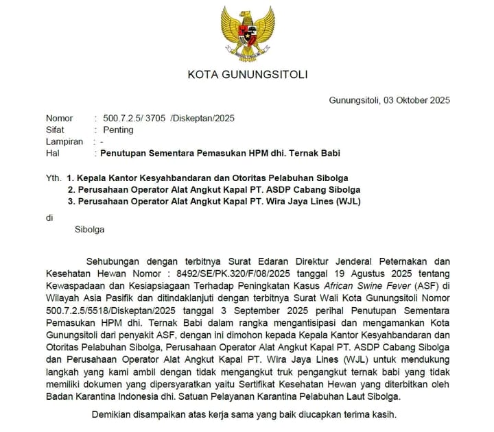 Sebagai tindak lanjut, Wali Kota Gunungsitoli telah menerbitkan Surat Nomor 500.7.2.5/5518/Diskeptan/2025 tanggal 3 September 2025 tentang Penutupan Sementara Pemasukan Hewan Pembawa Masuk (HPM) yaitu Ternak Babi. Surat tersebut dimaksudkan untuk mengantisipasi dan mengamankan Kota Gunungsitoli dari ancaman penyakit ASF yang hingga kini masih menjadi wabah di kawasan Asia Pasifik