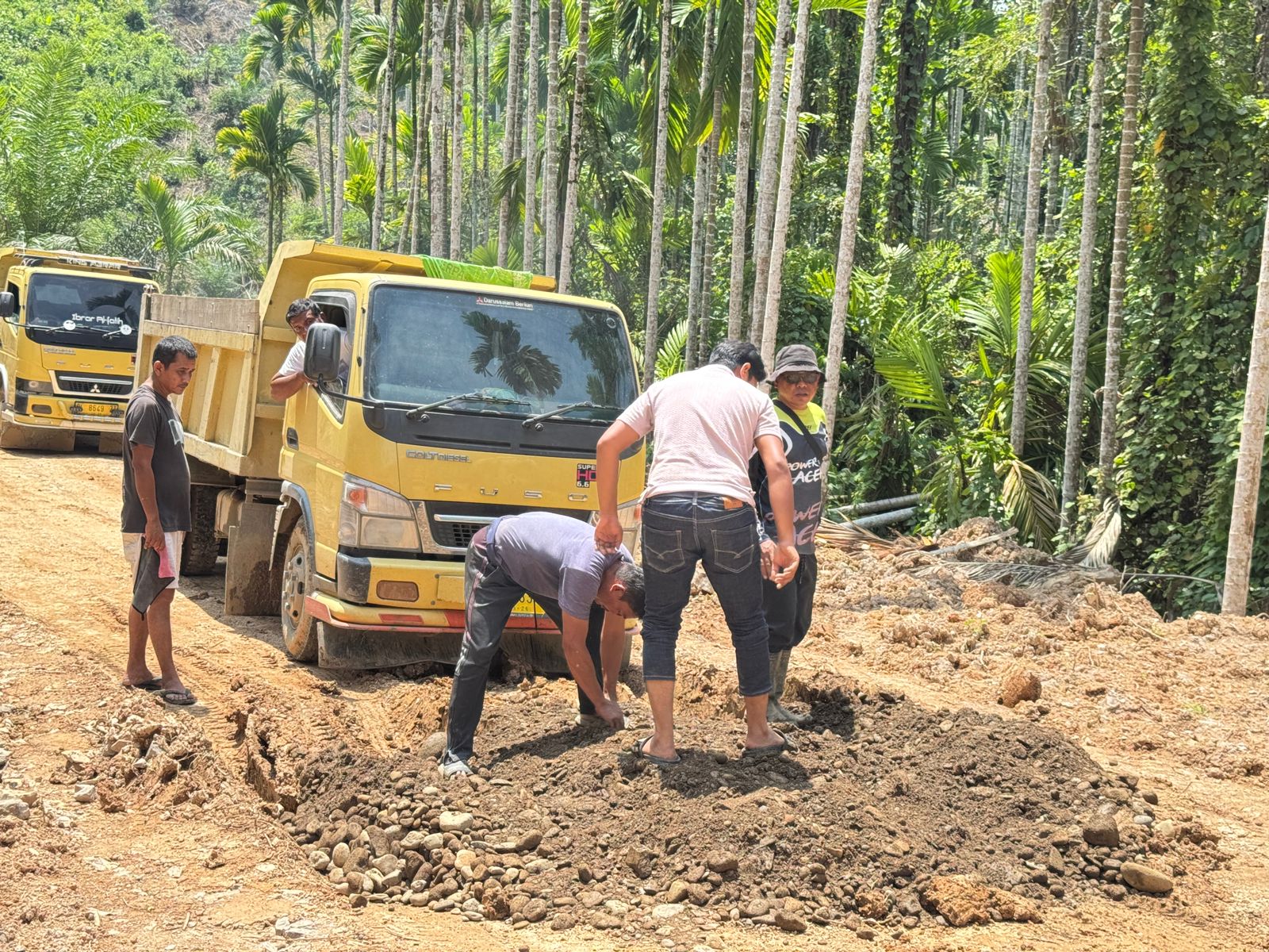 Material batu yang diangkut menggunakan kendaraan dump truck diturunkan langsung di badan jalan sebagai bagian dari proses pengerasan. Anggota Satgas TMMD terlihat sigap mengatur penempatan material agar proses pemerataan dan pemadatan dapat berjalan maksimal.