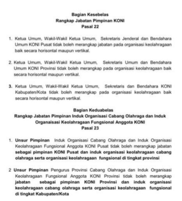 Purnawirawan Jenderal ini mencontohkan, ada beberapa unsur pimpinan KONI yang saat ini menjadi unsur pimpinan di cabang-cabang olahraga (Cabor) yang tidak sesuai dengan AD/ART KONI. Padahal, lanjutnya, terdapat di pasal 22 ayat 2 yang menyatakan bahwa unsur pimpinan KONI tidak boleh merangkap jabatan baik vertikal maupun Horizontal di cabang olahraga.