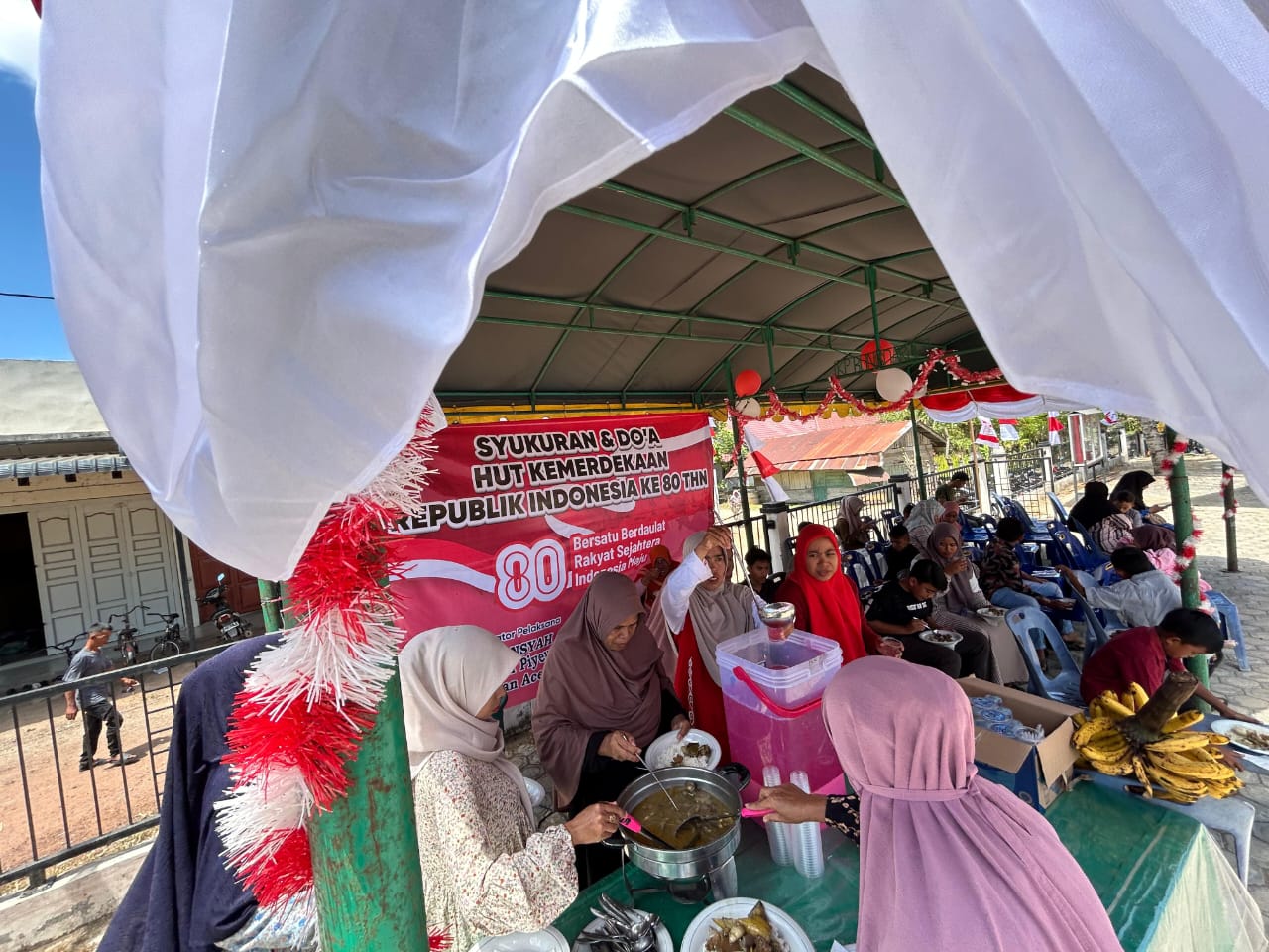 JANTHO — Eks Kombatan Aceh Rayeuk, Irmansyah atau yang akrab disapa Nukman Piyeung, bersama rekan-rekan seperjuangan menginisiasi kegiatan syukuran dan doa bersama dalam rangka memperingati Hari Ulang Tahun (HUT) ke-80 Kemerdekaan Republik Indonesia di Desa Bueng Daroh, Kemukiman Piyeung, Kecamatan Montasik, Kabupaten Aceh Besar, Minggu, 17 Agustus 2025.