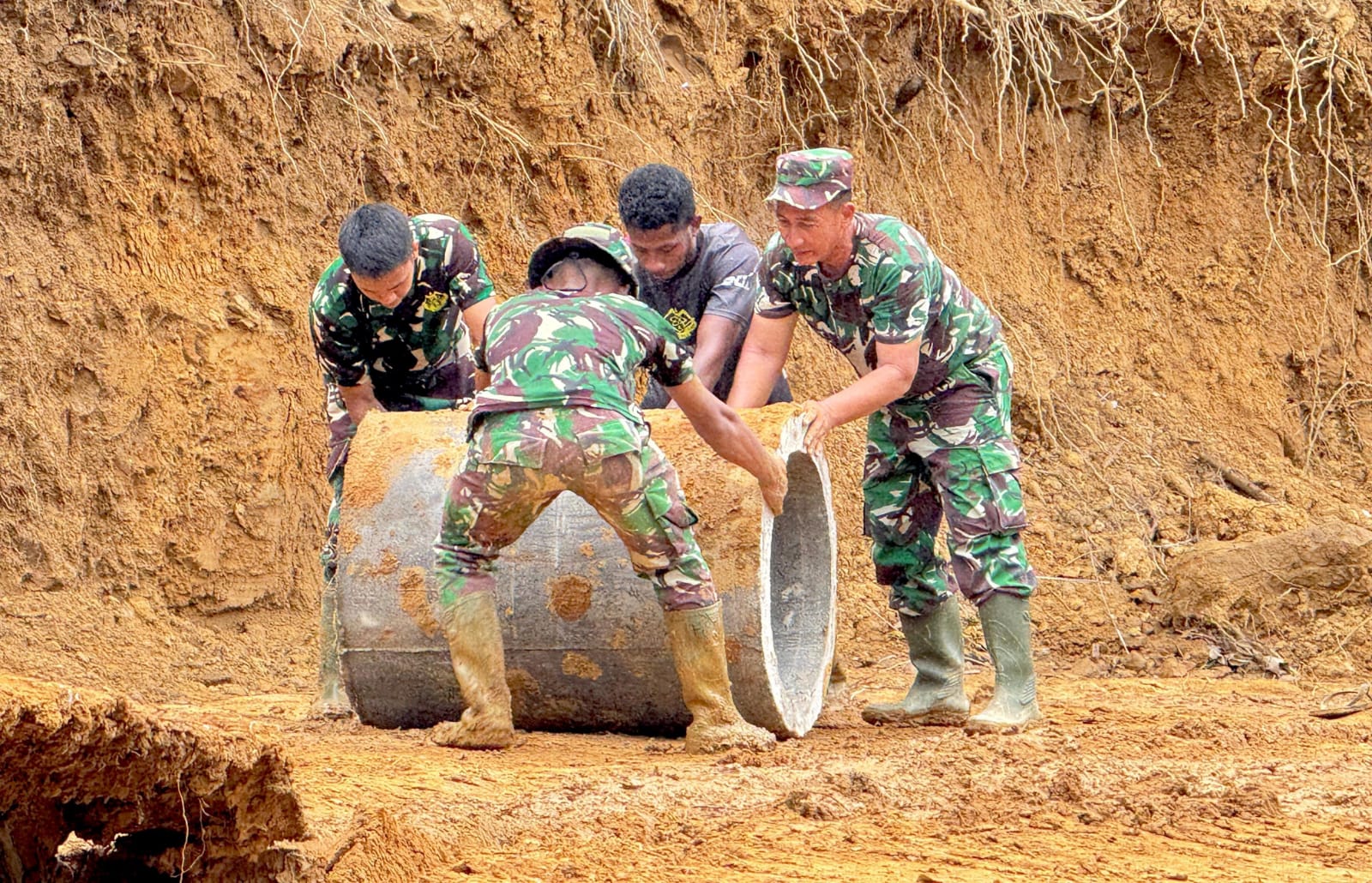 Anggota Satgas TMMD bersama masyarakat setempat tampak bahu-membahu dalam proses pemasangan, mulai dari penggalian, penempatan material hingga penimbunan kembali. Semangat gotong royong yang terjalin menjadi wujud nyata kemanunggalan TNI dengan rakyat dalam mendukung pembangunan desa.