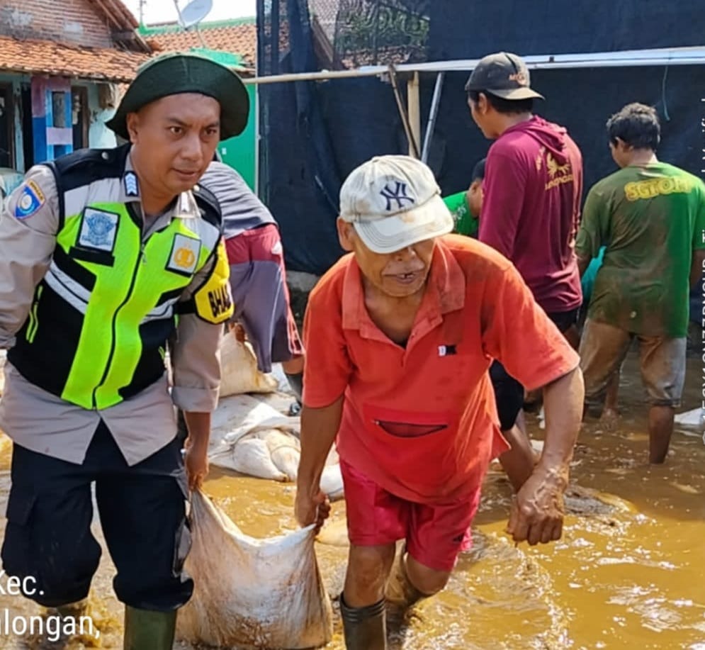 Personel Siaga Bhayangkara Tanggap Bencana Polres Pekalongan Kota secara bahu membahu bersama anggota Koramil Pekalongan Utara, personel Batalyon B Pelopor Satbrimob Polda Jateng, perangkat kelurahan, serta masyarakat setempat menyusun karung sebagai penguat tanggul.