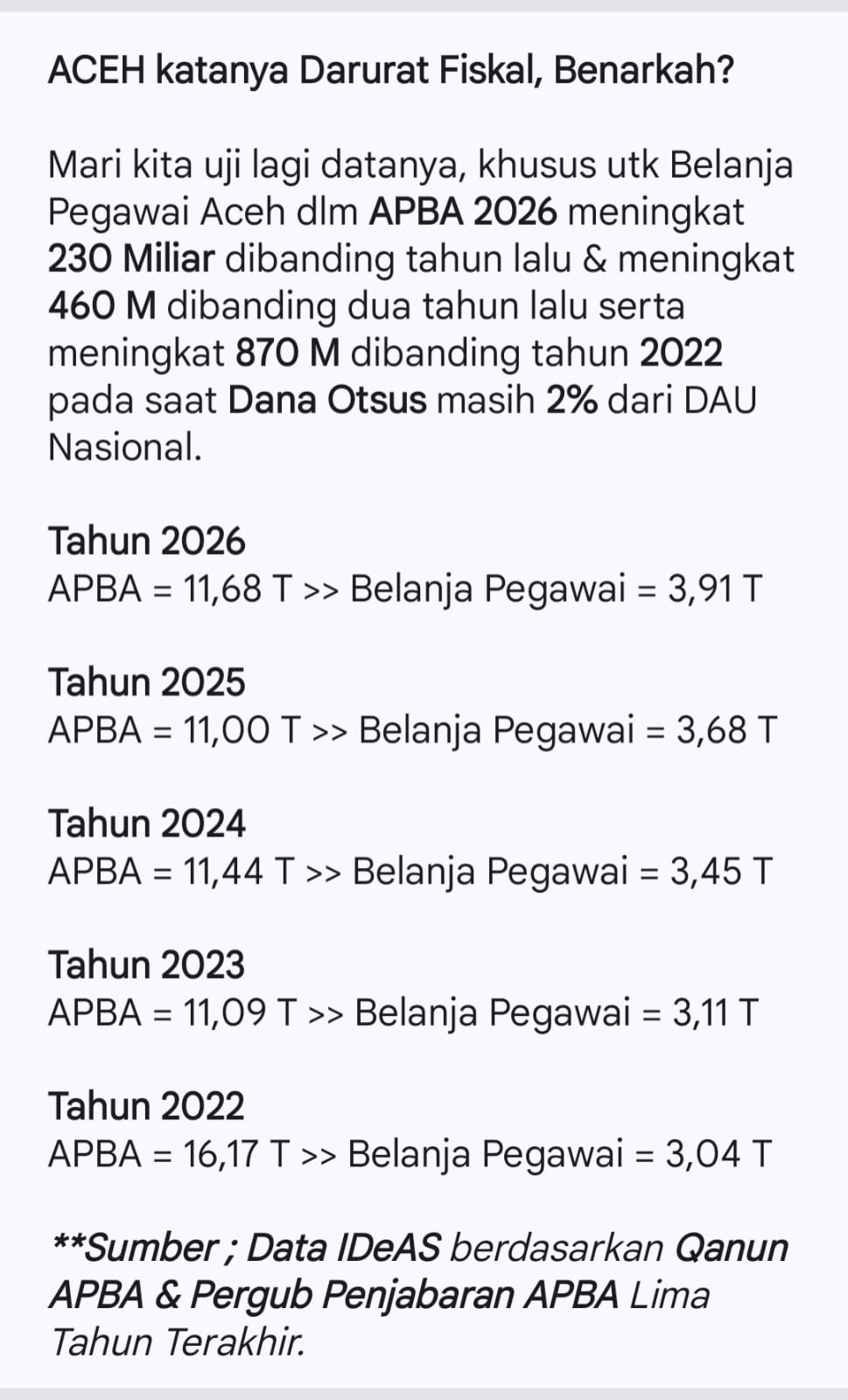 Dari data tersebut, pada tahun 2023 (tahun terakhir Dana Otsus 2 persen) pagu APBA sebesar Rp.16,17 Triliun dan Belanja Pegawai saat itu masih di angka Rp.3,04 T. Sementara di tahun 2026 ini, pagu APBA Rp.11,6 T dan Belanja Pegawai bengkak menjadi Rp.3,91 T. Kondisi tersebut justru bertolak-belakang dengan narasi bahwa “Aceh Daraurat Fiskal” karena Belanja Pegawai meningkat sebesar 870 Miliar dibanding tahun 2023 saat Dana Otsus masih 2 persen.